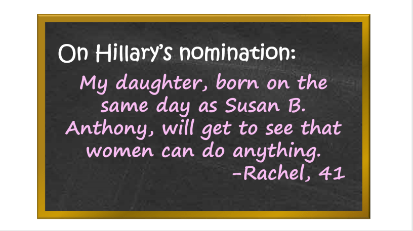 When Hillary accepts the nomination on Thursday, I will be watching with my 9-year-old daughter. She will see a smart, capable woman (a lawyer like her grandmother) rise higher than any American woman has before. My daughter, born on the same day as Susan B. Anthony, will get to see that women can do anything. We can be powerful and strong and charismatic.
