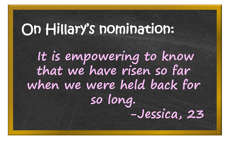 Well, that dream died rather quickly, but the anger I felt about my home country never having a woman in charge stuck with me. Fast forward to today, where I am a graduate student, surrounded by far more women than men. Women are fast outpacing men in education. While this is not necessarily a good thing, particularly when thinking about pay inequality, lack of representation in positions of power, etc., it is empowering to know that we have risen so far when we were held back for so long. Having a female presidential nominee is a sign to me that says there is an end in sight to this gender inequality battle. Maybe it won’t come with her, but I see Hillary as empowering women globally and accelerating the glacial pace of change we experience in the U.S.
