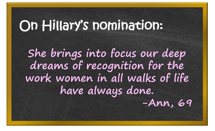 She has re-imagined herself many times and we have done so along with her. Now she brings into focus our deep dreams of recognition for the work women in all walks of life have always done. I, like Hillary, am no longer young. I, like she, want a world where our realities are equal, our talents are freed and our voices call forth for a nurturing, realistic and sustainable path for our world.