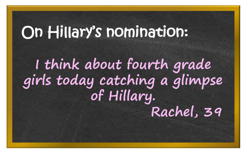 But that’s what I think of, when I think about what it means to me that the Democratic nominee for President of the country I love fiercely (no matter how hard that has become in the last 15 years, and, increasingly, the last several months). I think about fourth grade girls today – even ones stuck wearing skirts – catching a glimpse of Hillary. Perhaps to them, the idea that they, too, could someday run for president will not be a joke.