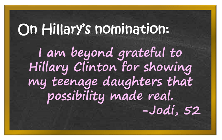 I remember as a young woman how people scoffed at the idea that Geraldine Ferraro could become Vice President. I remember how discouraged I felt about the possibility of a woman becoming President of the United States in my lifetime. While I have issues with her, I am beyond grateful to Hillary Clinton for showing my teenage daughters that possibility made real.