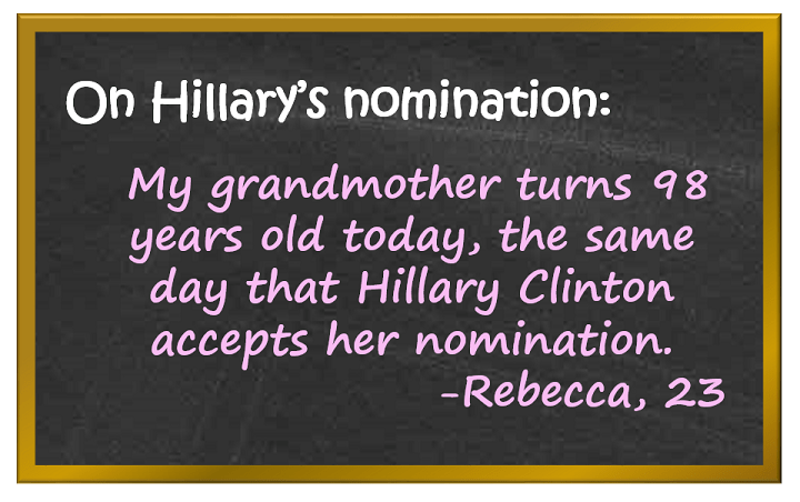 Although change often feels like it is occurring at snail’s pace, I think about how much progress my grandmother has witnessed in her own lifetime. It’s easy to become disheartened when we hear stories about how sex and gender discrimination still play such a prominent role in our society. We should be angry about this and fight for better. However, at the same time, this is a collective moment where we should also celebrate. To me, Hillary Clinton’s nomination represents change, hope and progress for all women in this country. She has risen to place that at one time not too long ago seemed unimaginable.