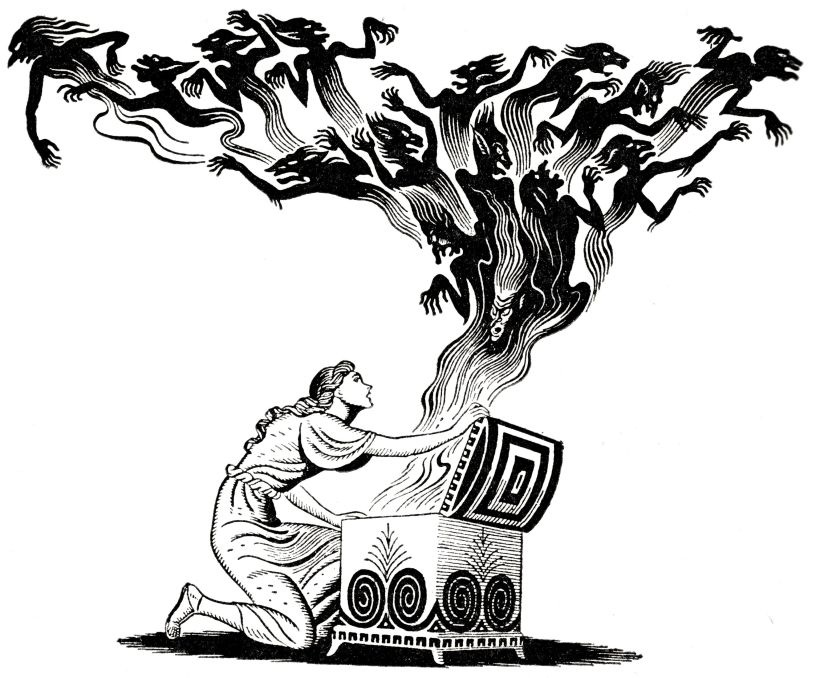 In the Greek myth, Zeus creates Pandora- the first mortal woman-in order to punish Prometheus for giving man fire (so, yes, the Greeks were misogynistic in their origin myths as well). Pandora, beauty and temptation incarnate, marries Prometheus’s half-brother Epimetheus, bringing with her an ornately decorated box (or more accurately jar) as a wedding gift with the instructions never to open it. Unbeknownst to Pandora and Epimetheus, Zeus had filled the box with all the ills of the world. Overcome by curiosity, Pandora opens the box- allowing sickness, death, jealousy, strife, hatred, famine, turmoil etc. to fly out. Struggling, she closes the box, leaving only one thing remaining within it- hope.